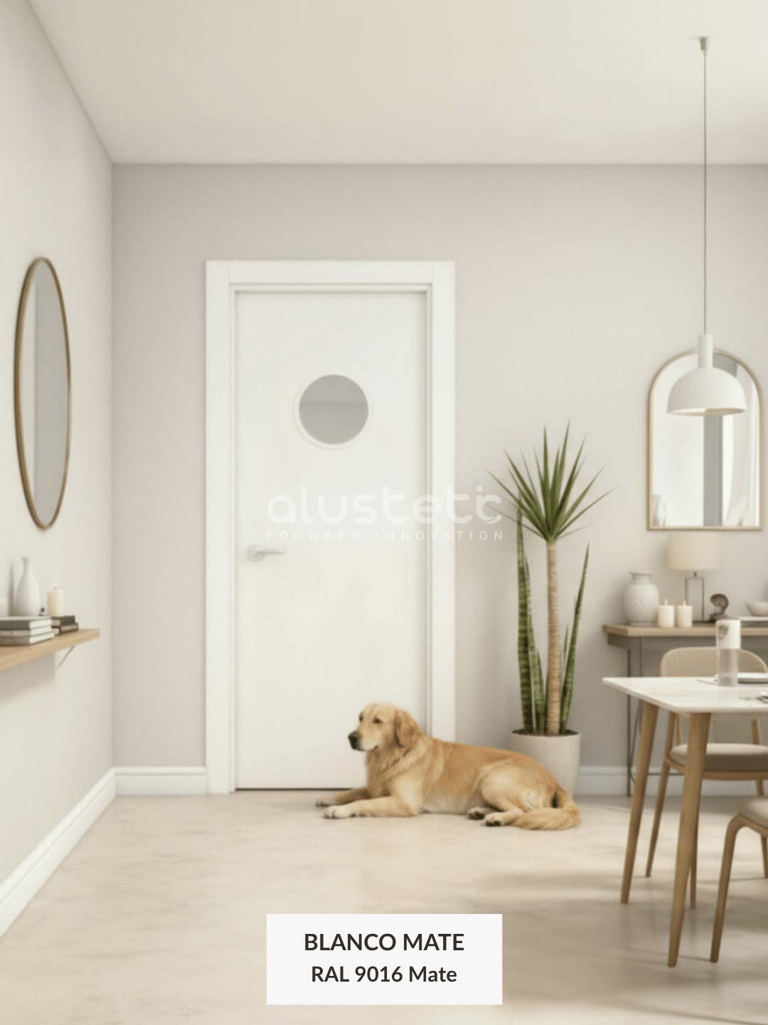Puerta interior en block de aluminio visualmente identicas a las de madera, con cerradura de imán que amortigua el golpe y ruido y resitente a los factores ambientales más comunes que estropean la madera.
